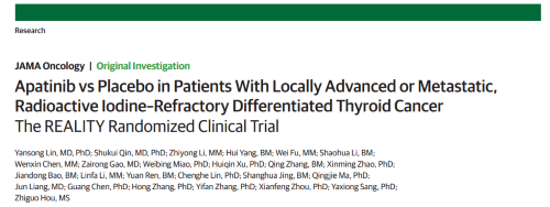 2021年12月16日,权威医学杂志《JAMA Oncology》(影响因子31.777)在线发表阿帕替尼的一项III期临床研究(REALITY)——甲磺酸阿帕替尼片治疗局部进展/转移性放射性碘难治性分化型甲状腺癌(RAIR-DTC)患者的多中心、随机、双盲、安慰剂对照临床研究。此研究由北京协和医院的林岩松教授和南京金陵医院的秦叔逵教授发起,在全国21个研究中心展开,由AG电子医药中央医学事务部团队支持完成。