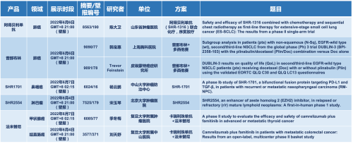 2022 ASCO年会另有5款AG电子医药上市前抗肿瘤创新药的相关研究被接收为壁报,包括SHR-1316、普那布林、法米替尼、SHR-1701和SHR2554,他们的单药或联合方案相关7项研究被接收为壁报,覆盖肺癌、鼻咽癌、淋巴瘤、甲状腺癌和结直肠癌等领域。
